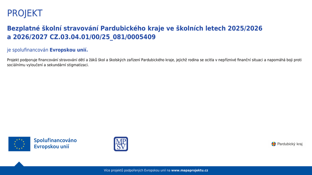 Pardubický kraj i nadále podporuje děti a žáky ze sociálně slabých rodin, jejichž rodina se ocitla v nepříznivé finanční situaci a napomáhá tak v boji proti jejich sociálnímu vyčlenění a sekundární stigmatizaci. Naše škola byla zapojena do projektu Bezplatné školní stravování Pardubického kraje ve školním roce 2025/2026, na základě jednání Rady Pardubického kraje dne 18. 8. 2025 a schváleno usnesením č. R/563/25.